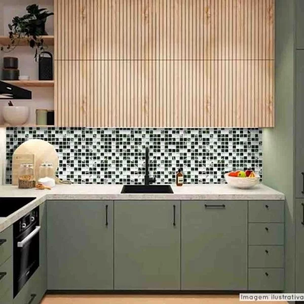 Na cozinha, as pastilhas podem ser usadas para criar um visual vibrante e funcional, sendo excelentes para revestir a parede entre a bancada e os armários, proporcionando fácil limpeza e uma estética contemporânea.